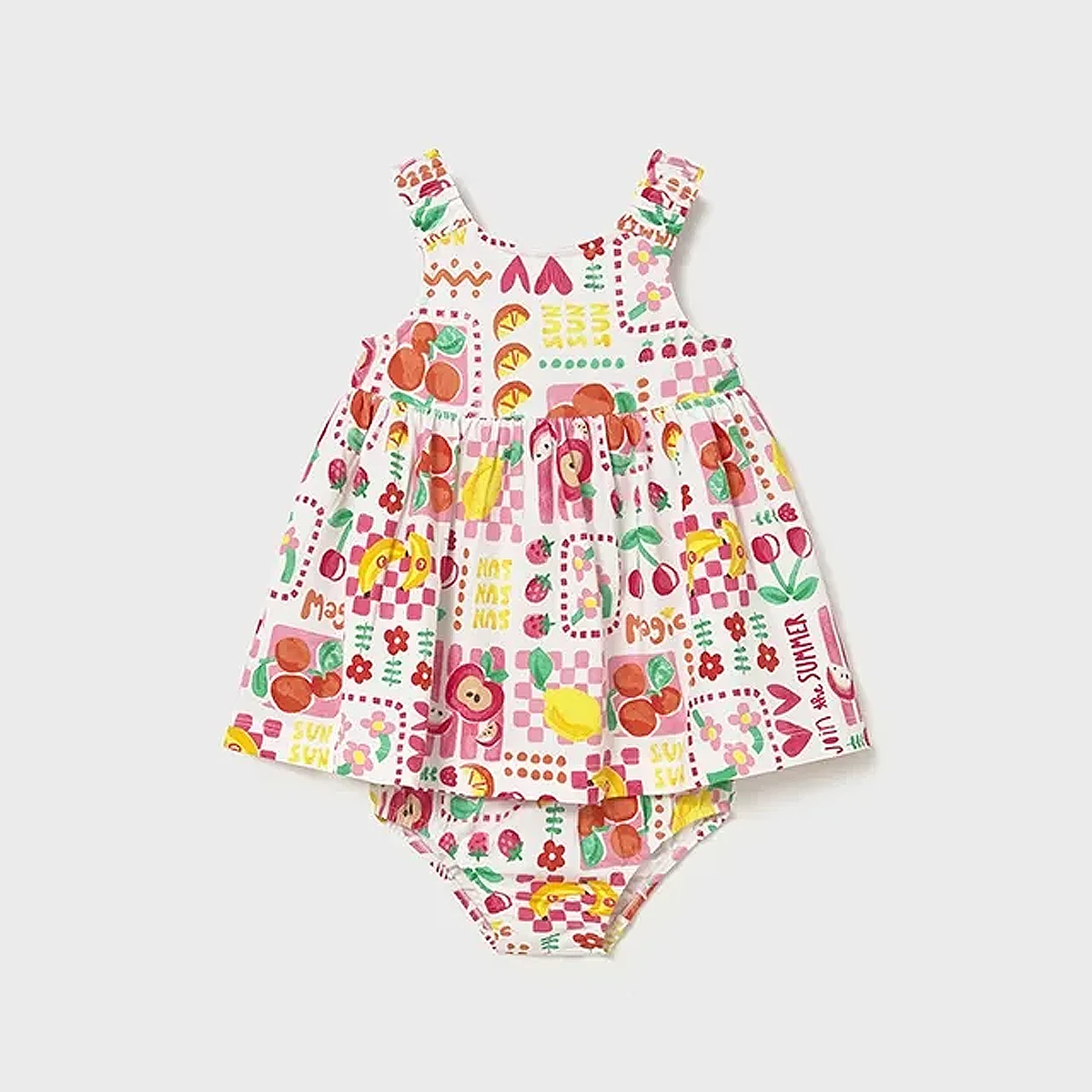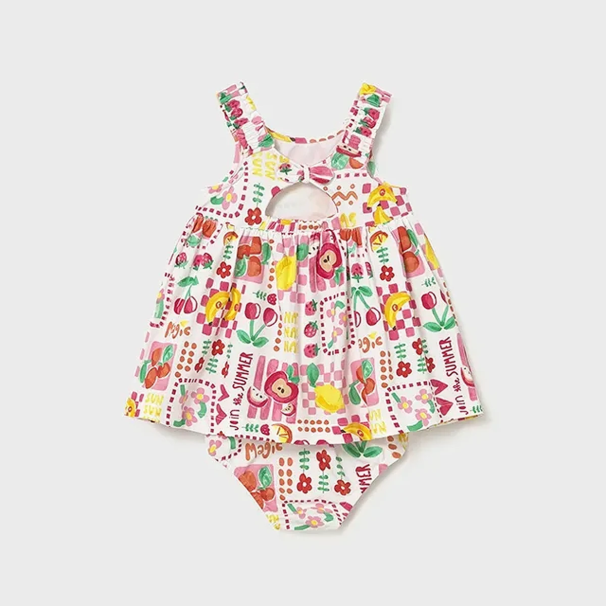 A vibrant celebration of summer in one adorable set! This Mayoral outfit combines a breezy, flared dress with a matching diaper cover, featuring a high-energy “Join the Summer” print. Perfect for warm-weather adventures, this set ensures your little one stays cool while looking sweet and stylish.