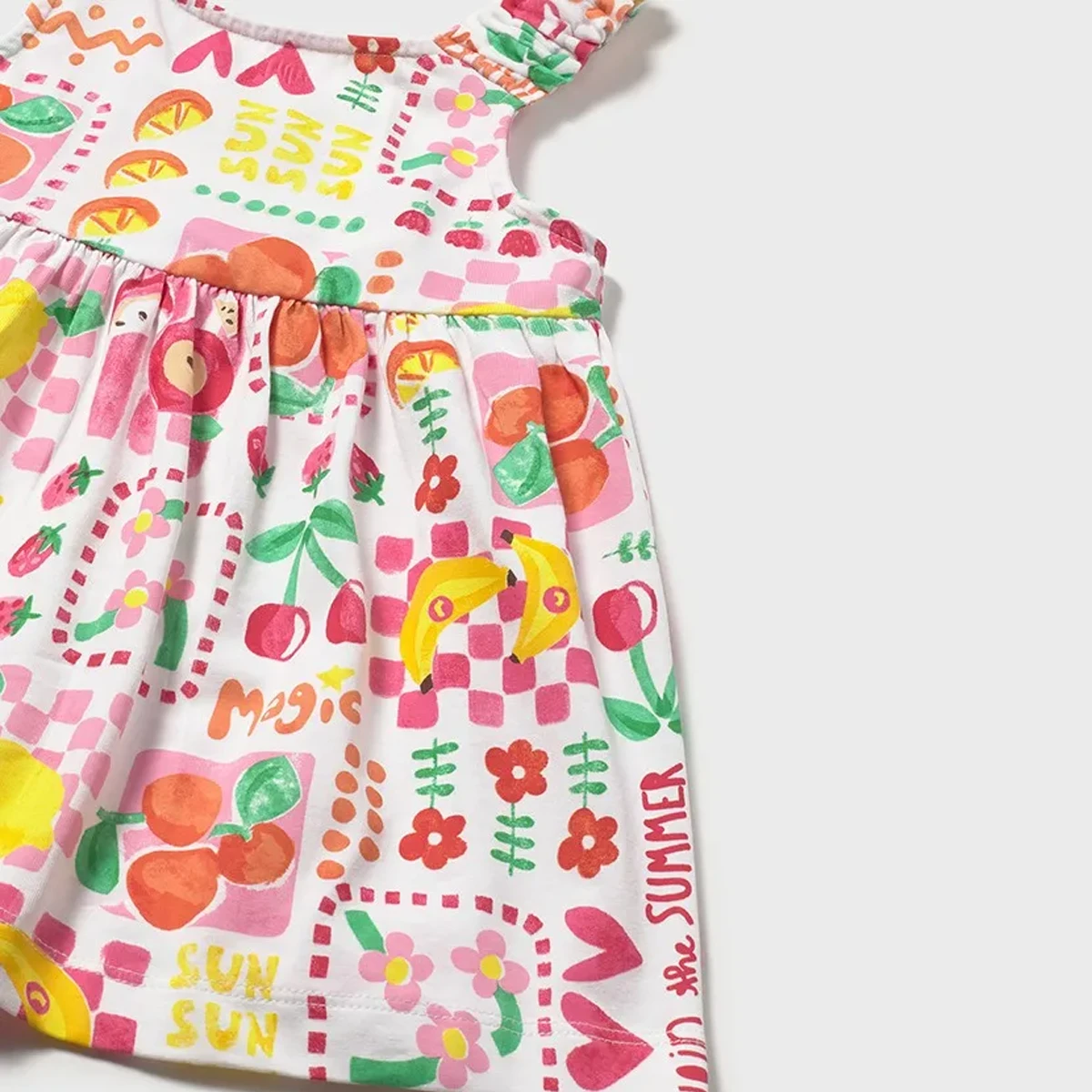Vibrant Summer Motif: This dress is a “fruit salad” of fun, featuring lemons, bananas, cherries, and strawberries mixed with trendy pink checkered patterns and cheerful “Magic” and “SUN” graphics.