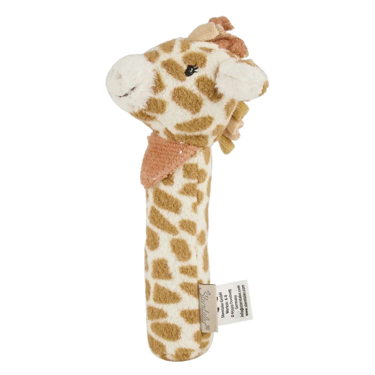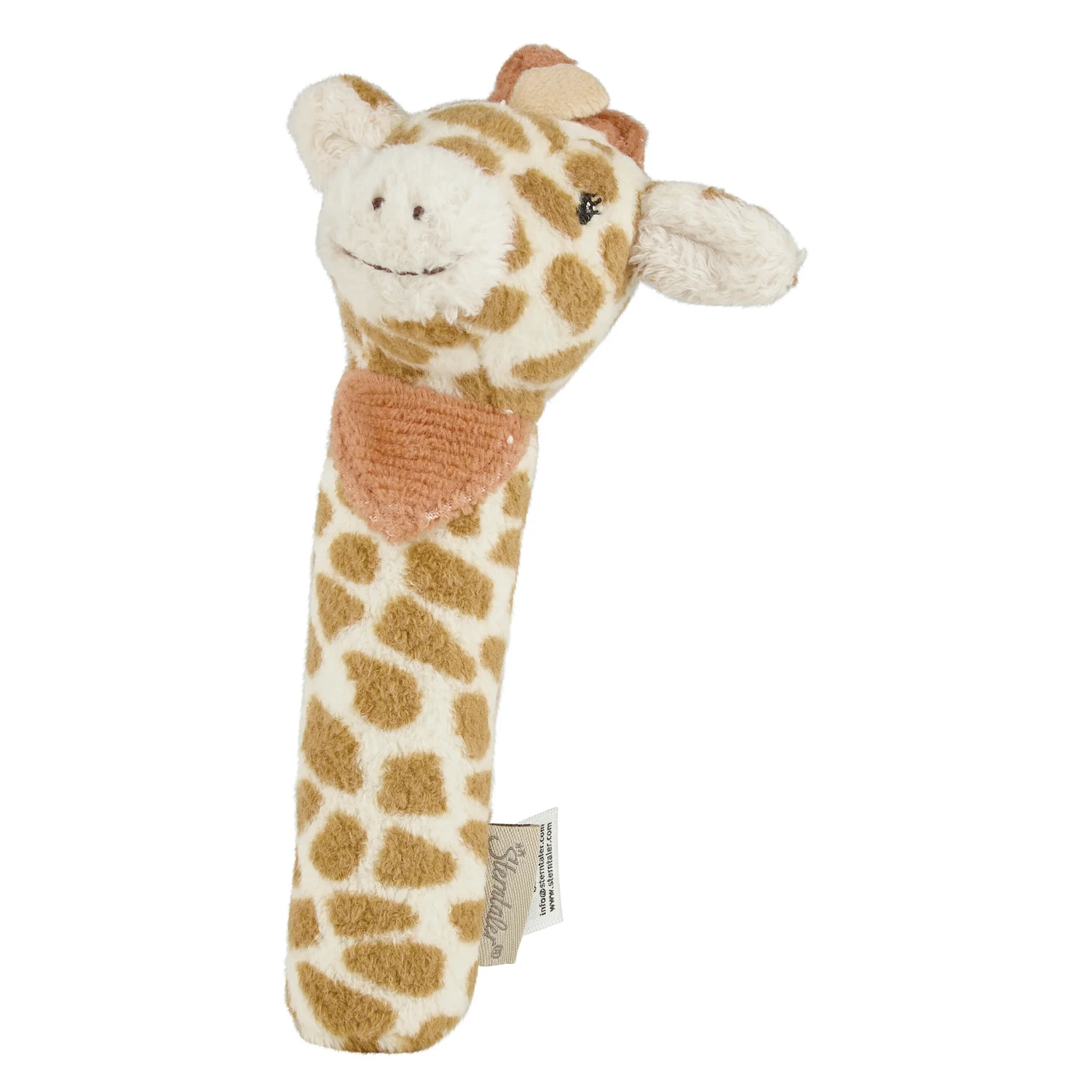 Charming Safari Style: Kaya sports a stylish terracotta-coloured neckerchief and a friendly embroidered smile, adding a touch of classic nursery whimsy to this modern developmental toy.
