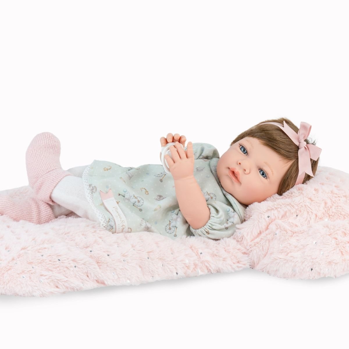 This stunning 45 cm Reborn doll is handcrafted in Spain with meticulous attention to detail. Designed to feel just like a real newborn, she features a weighted body (approximately 1.700 kg) and articulated limbs that allow her to adopt natural, baby-like postures.