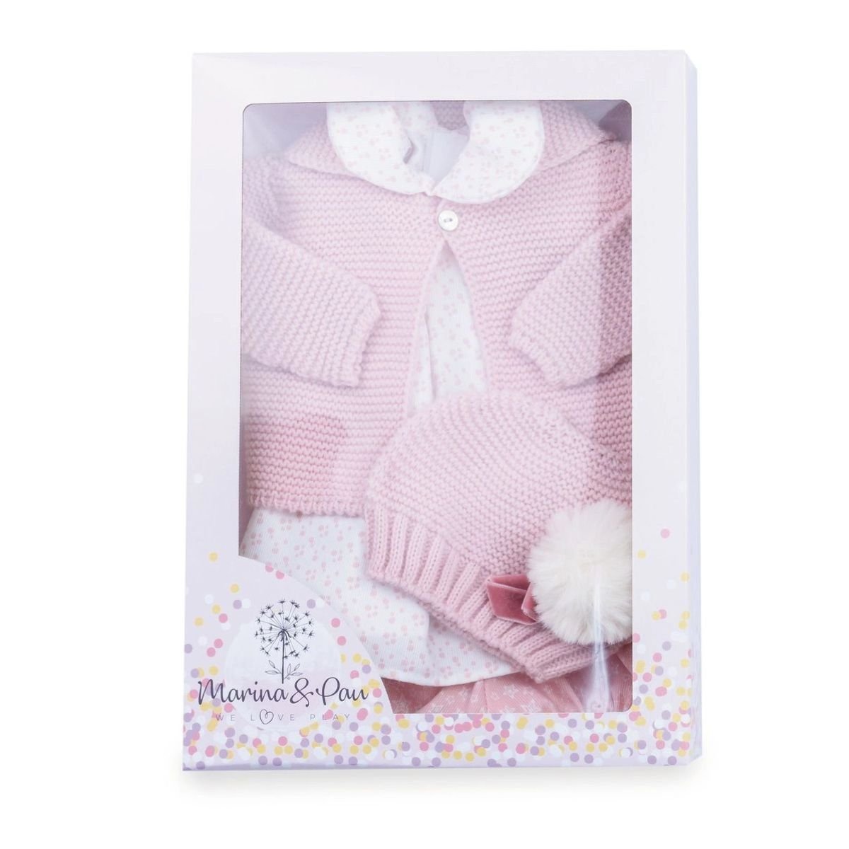 This high-quality outfit is specifically sized to fit 45 cm dolls of the Reborn edition. The set comes complete with a cosy pink knitted cardigan, a matching knitted hat topped with a soft white pom-pom, and a sweet white dress with a delicate pink and white patterned skirt.