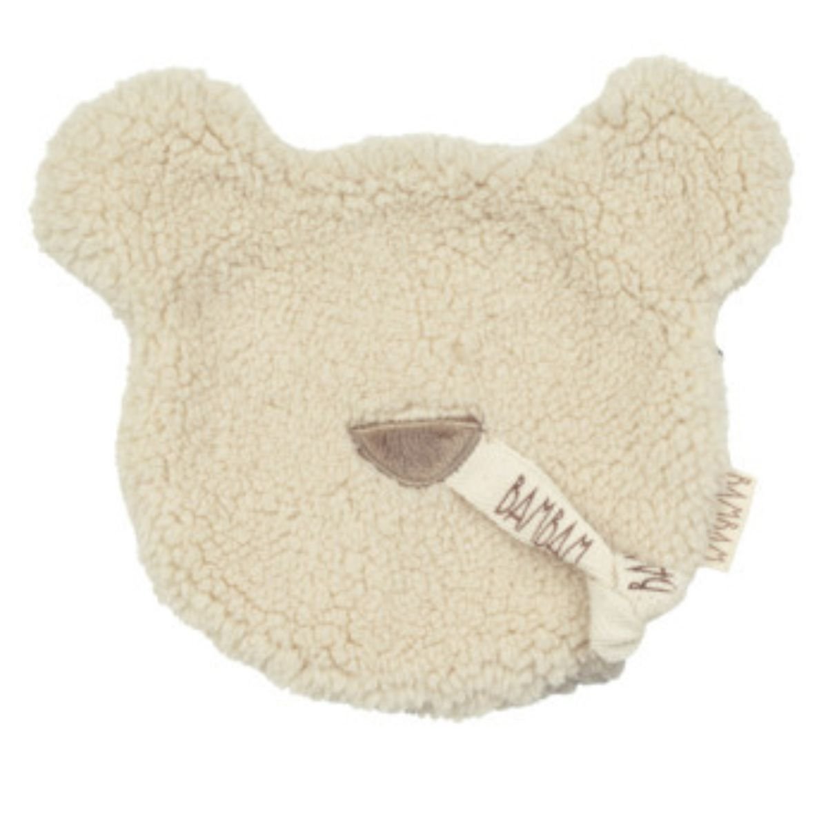Design: A cream-coloured bear-head shaped cloth with a dapper stitched nose and a branded “BAMBAM” tag.
