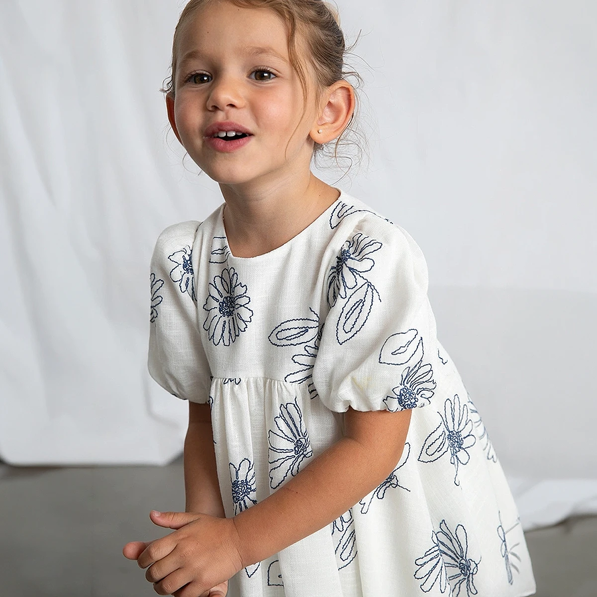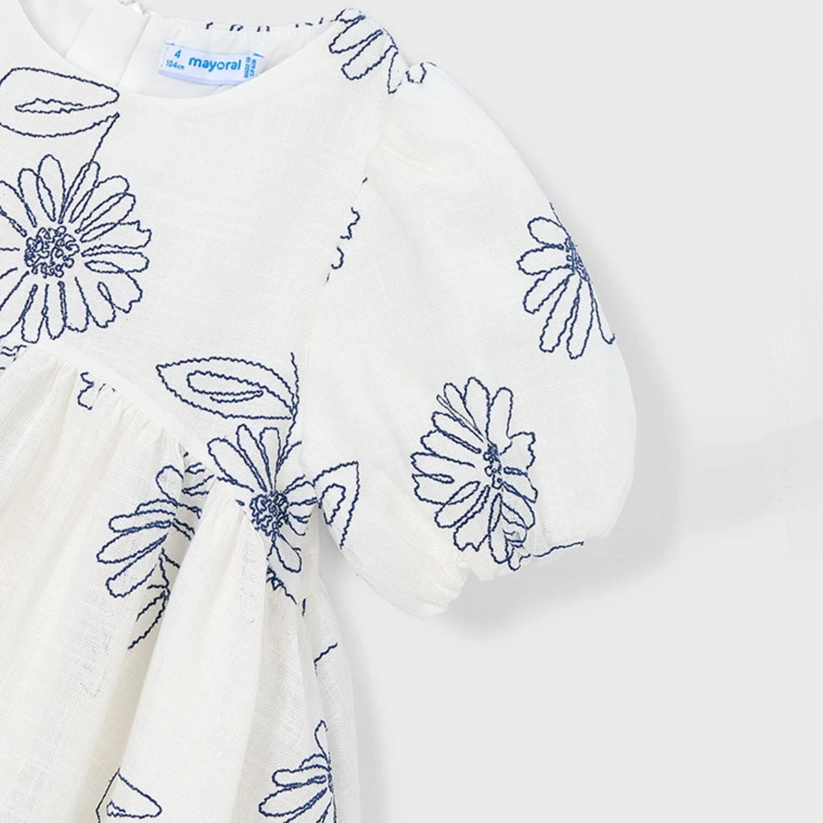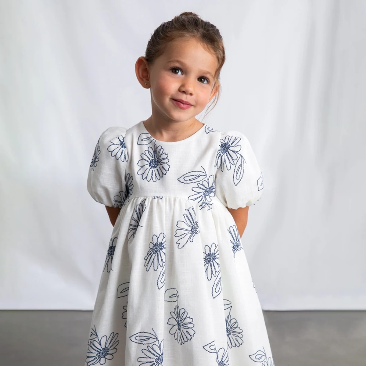 Delicate Daisy Embroidery: The dress features a stunning all-over daisy motif embroidered in deep navy blue, creating a striking contrast against the crisp white fabric.