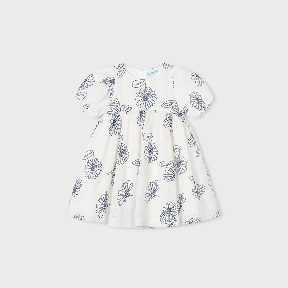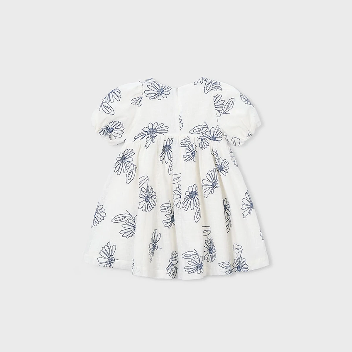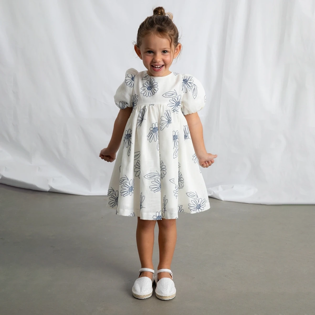 Delicate Daisy Embroidery: The dress features a stunning all-over daisy motif embroidered in deep navy blue, creating a striking contrast against the crisp white fabric.