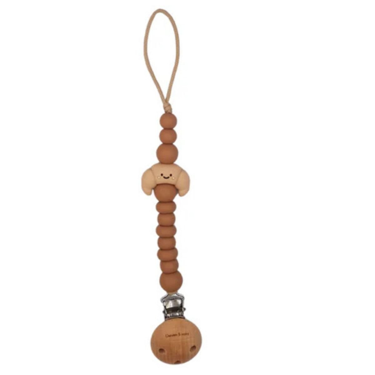 Keep your baby’s favourite pacifier safe and off the ground with this charming croissant-themed clip. Featuring a delightful croissant charm nestled among high-quality silicone beads in warm, earthy tones, this accessory is designed to stimulate your little dreamer’s curiosity as they begin to distinguish different shades. Crafted from a blend of food-grade silicone and natural beech wood, it brings a touch of unique, handcrafted style to every outdoor outing.