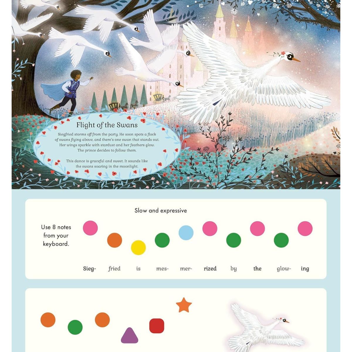 This beautifully illustrated sound book features a built-in 14-key keyboard that invites children to learn real classical music in the simplest way possible. Using a clear colour and shape-coded system, even the youngest musicians can play eight memorable melodies—from the graceful “Flight of the Swans” to the dramatic “Dance of the Little Swans”—building confidence with every note.