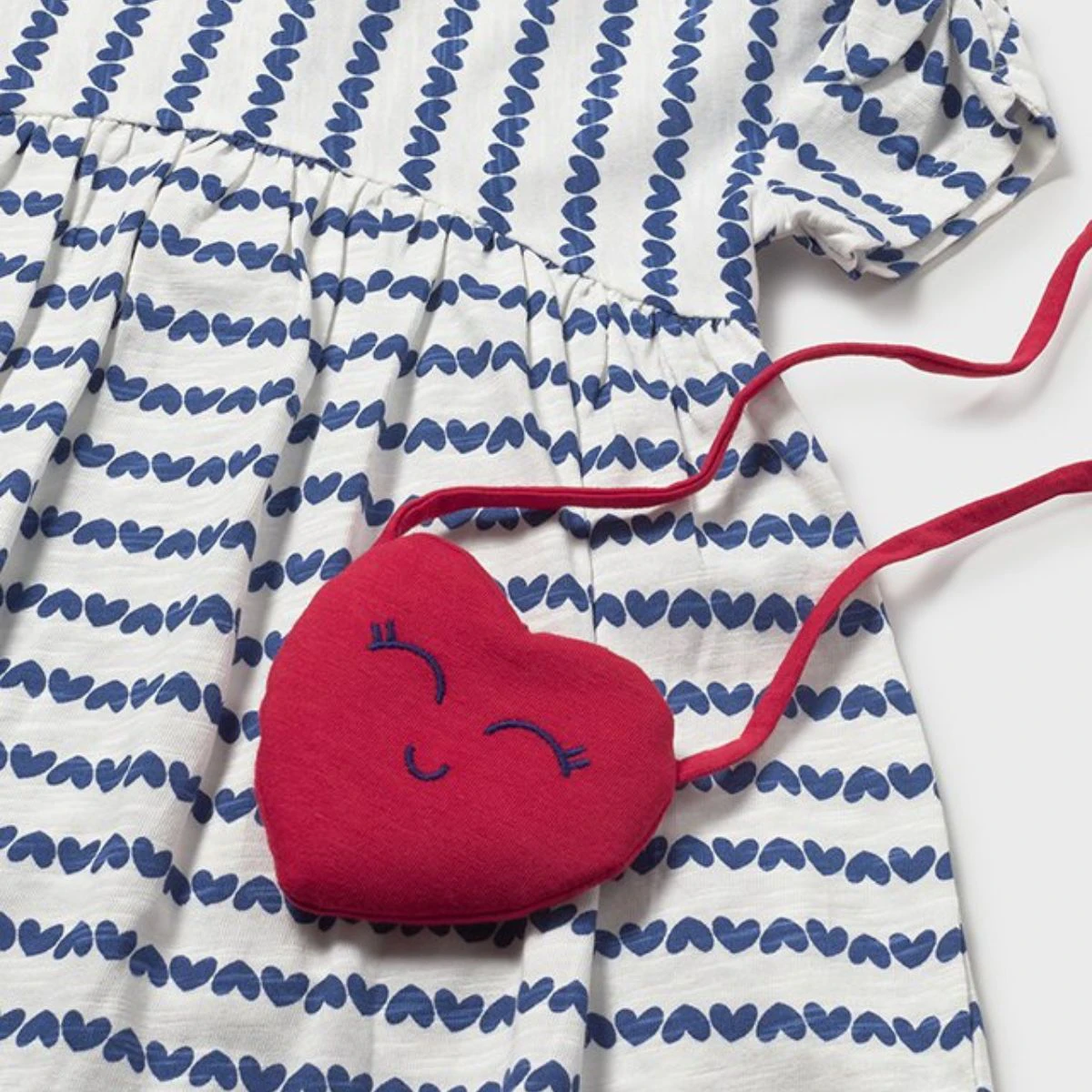 Coordinated red crossbody heart bag with a soft-touch finish and embroidered facial details.