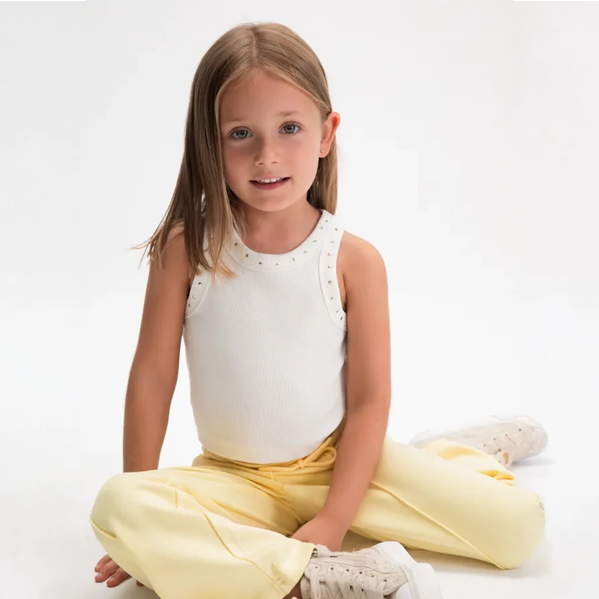 Add a touch of storybook magic to her summer wardrobe with this enchanting off-white tank top. Designed for little dreamers who love a hint of sparkle, it features shimmering metallic studs that catch the sunlight during garden explorations or seaside strolls. Crafted from a soft-touch ribbed cotton blend, this piece ensures she stays cosy and stylish throughout every enchanted chapter of her day.