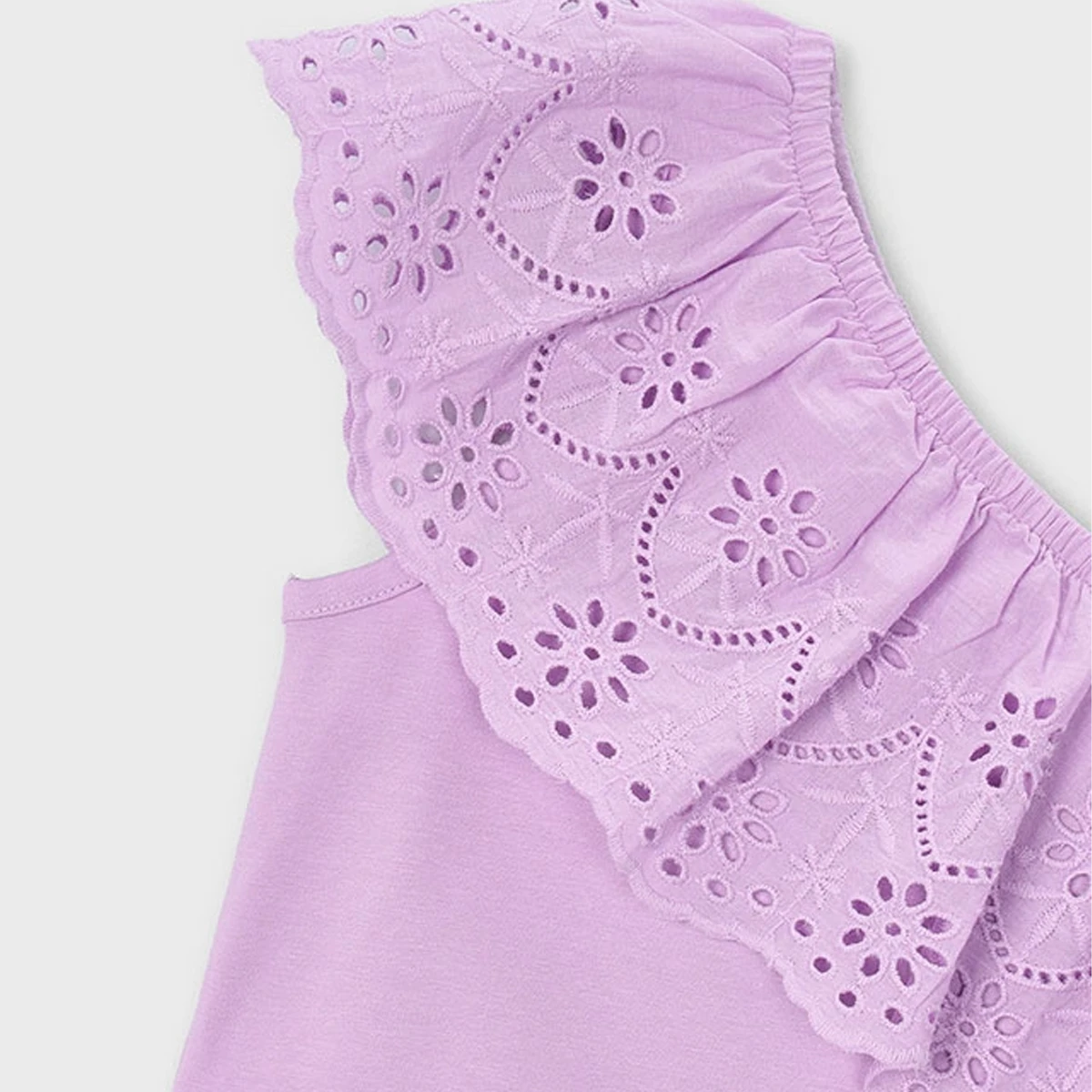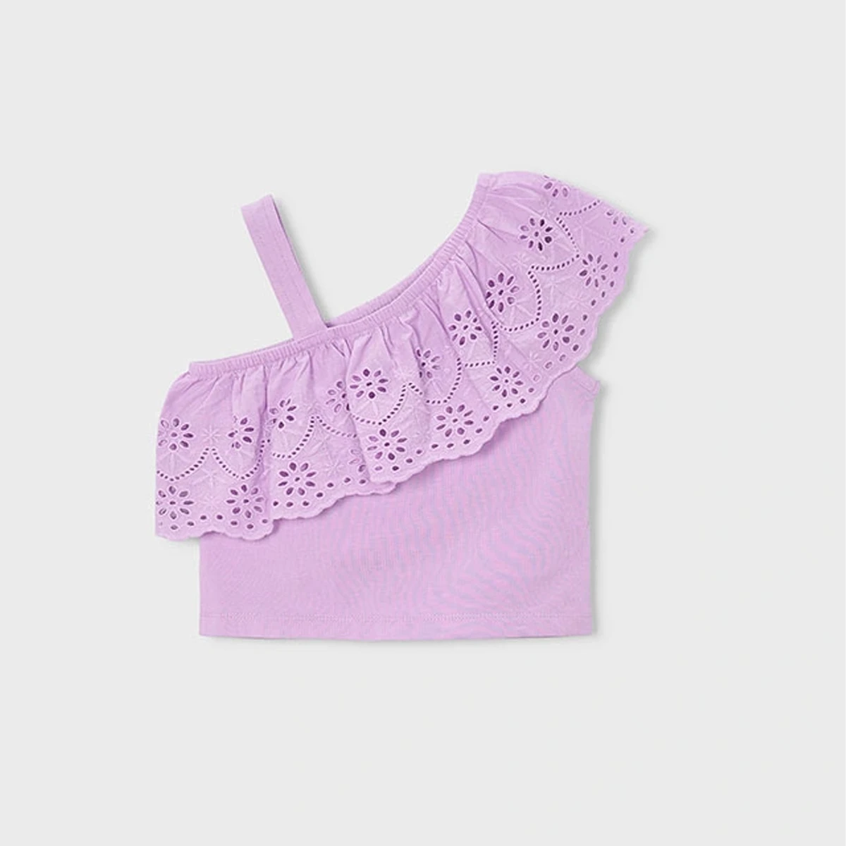 Add a touch of asymmetrical charm to her summer wardrobe with this chic lilac tank top. Balancing a modern silhouette with classic floral details, it’s a versatile piece that transitions effortlessly from casual garden play to a polished birthday party look.