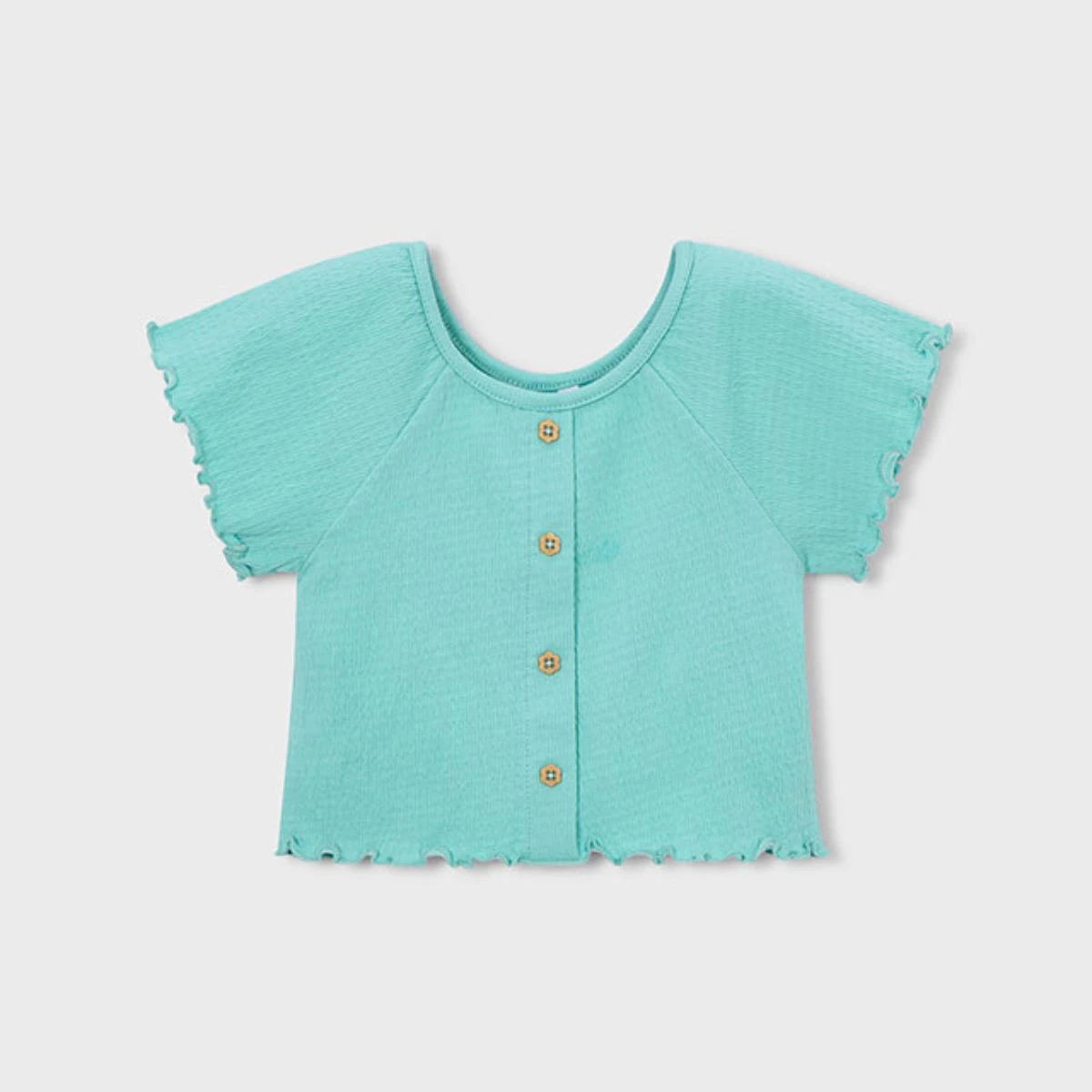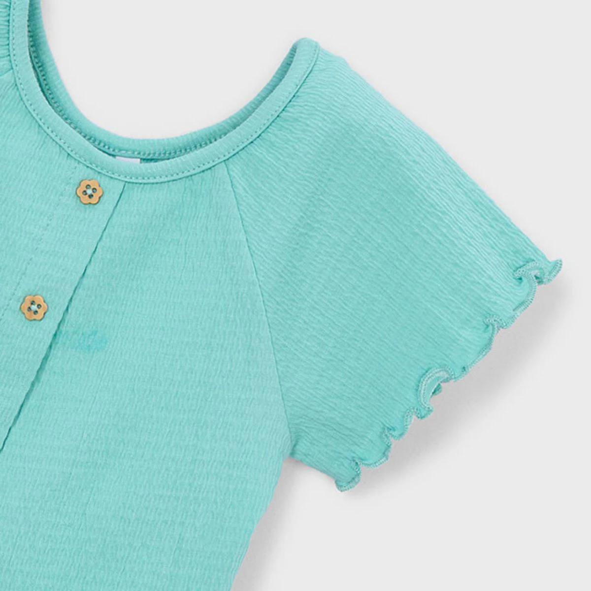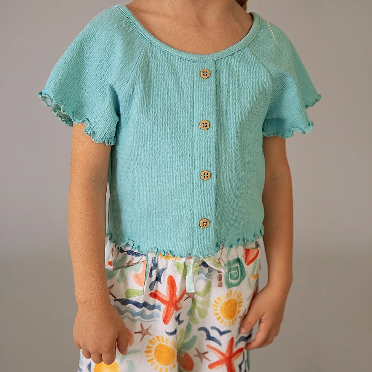Textured Turquoise Top: Features a soft, ribbed knit t-shirt adorned with four sweet flower-shaped wooden buttons and delicate “lettuce” ruffle trims on the sleeves and hem.