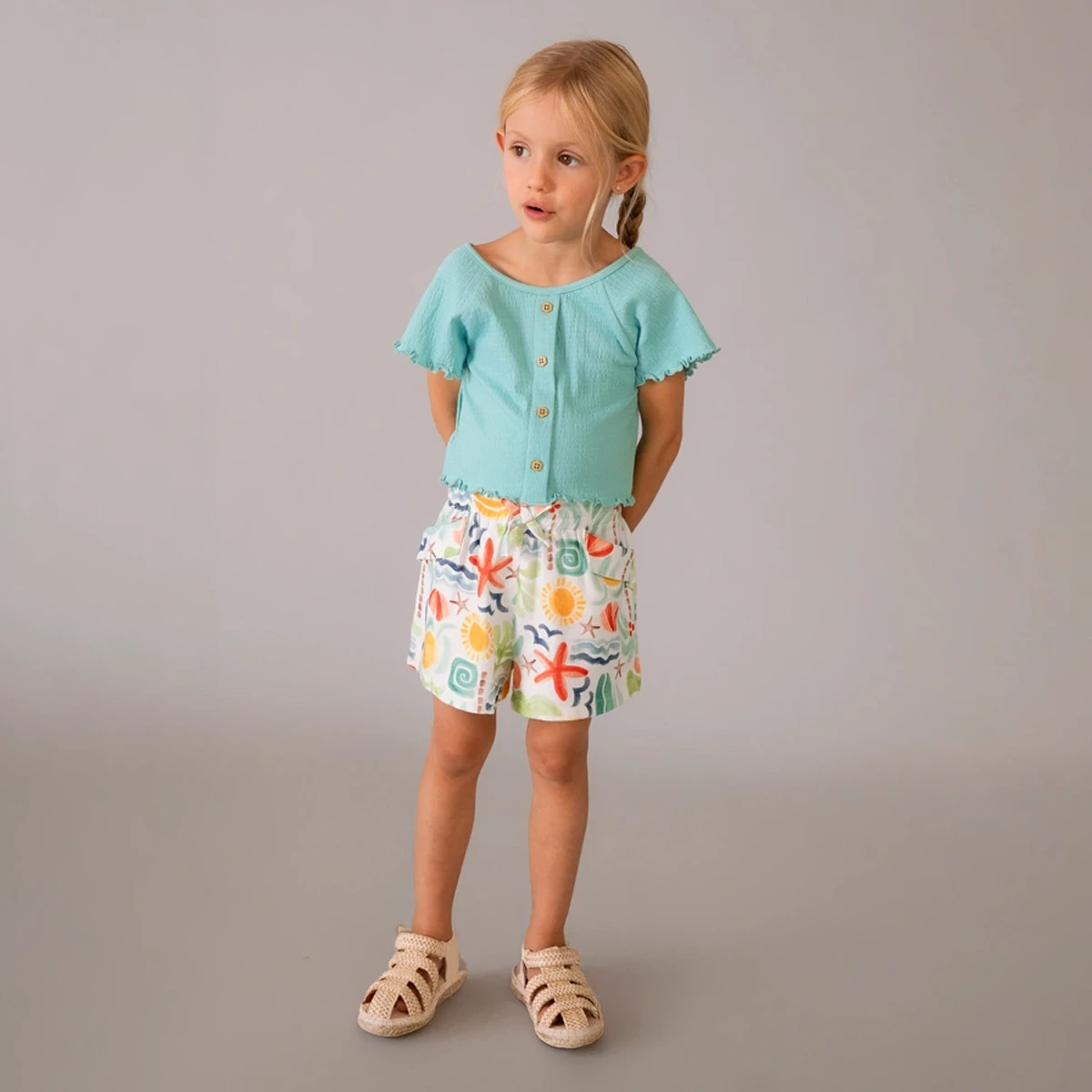 Bright, breezy, and ready for adventure. This charming two-piece set pairs a textured turquoise top with whimsical tropical shorts, creating the perfect “ready-to-go” outfit for sun-soaked days and seaside play.