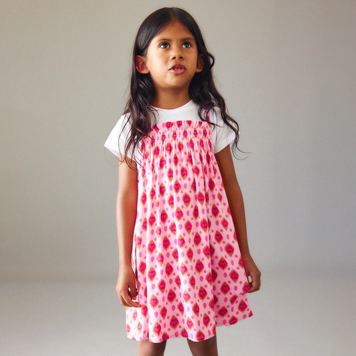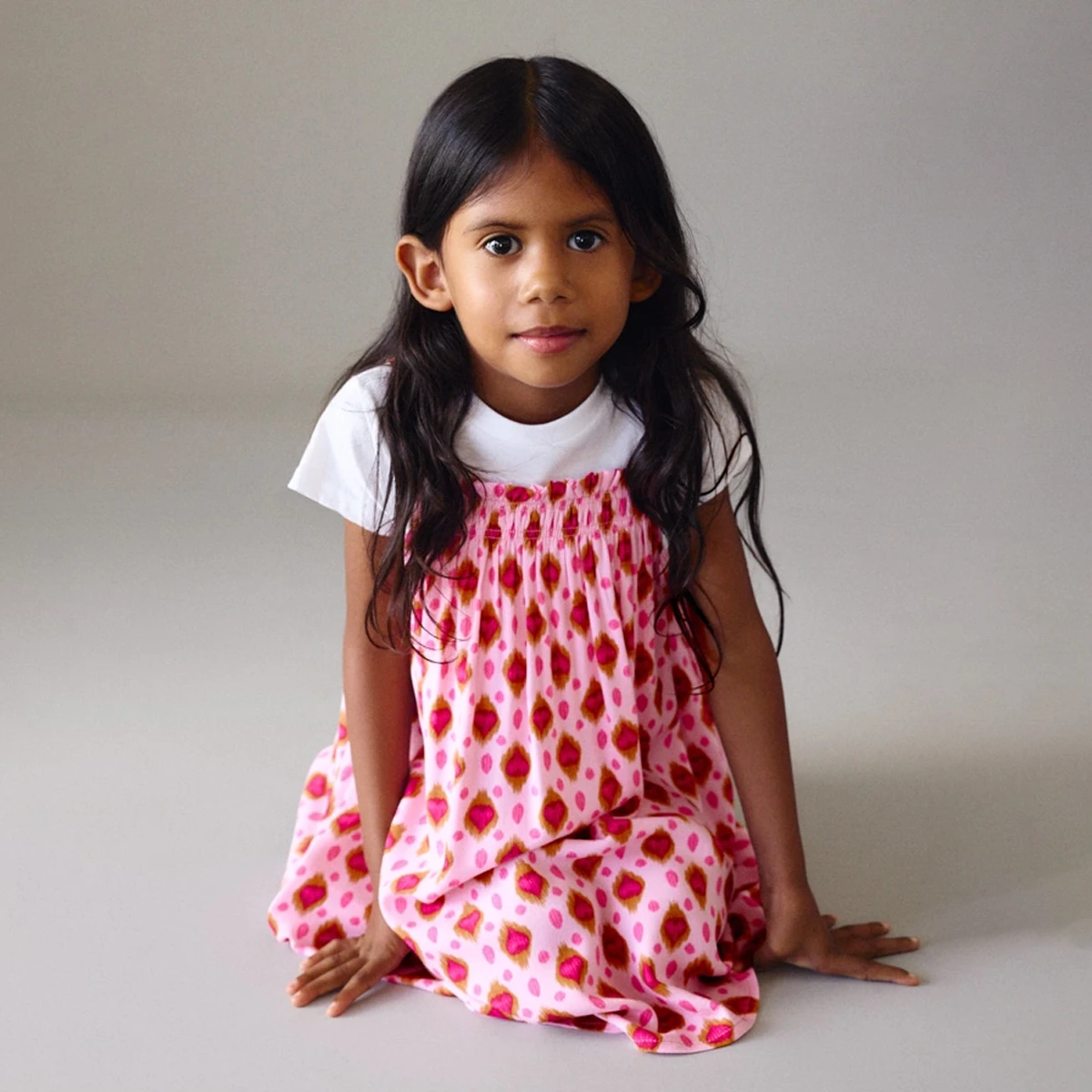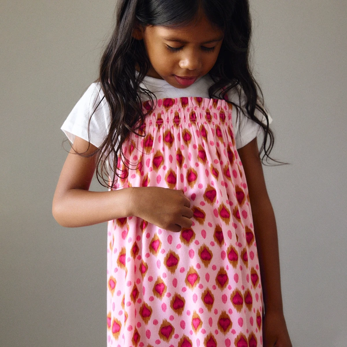 Vibrant Ikat Print: Adorned with a playful magenta “teardrop” ikat pattern over a candy pink base, adding a touch of global-inspired flair to her summer wardrobe.