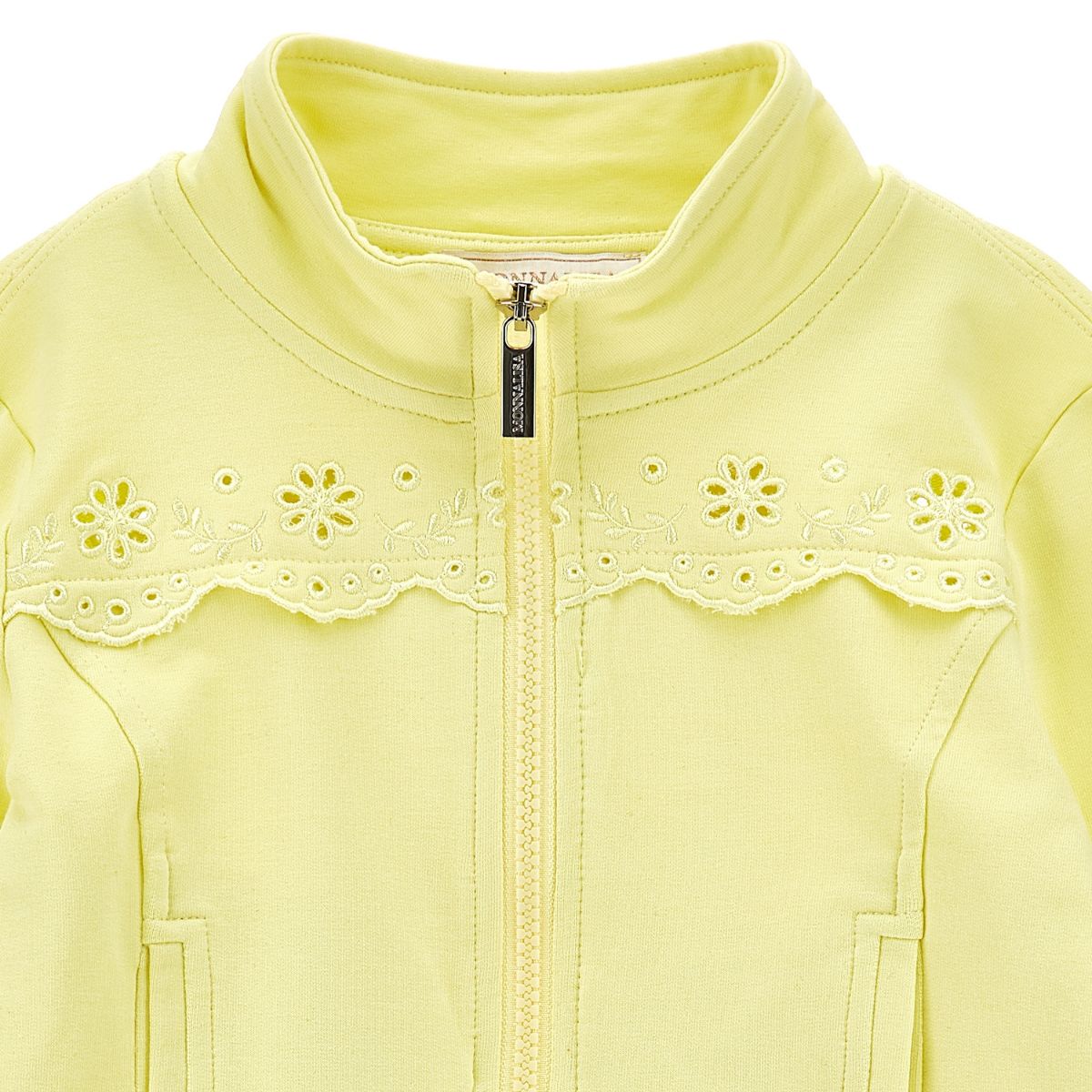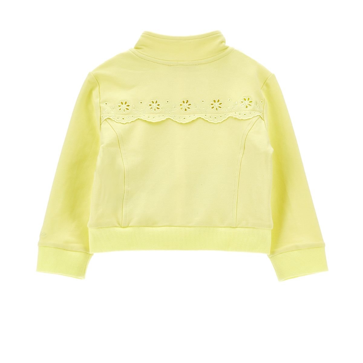Brighten her wardrobe with this cheerful light yellow sweatshirt, a sweet and airy layer perfect for springtime explorations. Adorned with delicate floral eyelet embroidery and a whimsical scalloped trim across the chest and back, it brings a touch of storybook charm to her daily adventures.